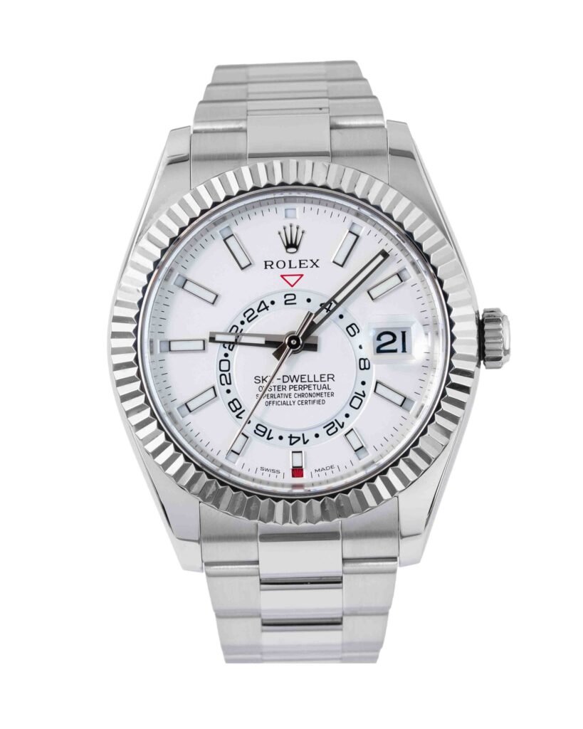 brand: Rolex Reference: 326934 Model: Sky-Dweller case MATERIAL: Steel strap: Bracelet case Size (MM): 42mm Dial colour: White Bezel: White Gold Year: 06/2020 Condition: Excellent Box papers : Paperwork/box