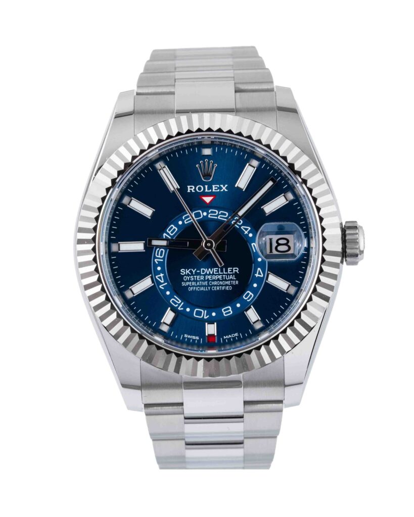 brand: Rolex Reference: 326934 Model: Sky-Dweller case MATERIAL: Steel strap: Bracelet case Size (MM): 42mm Dial colour: Blue Bezel: White Gold Year: 08/2022 Condition: Excellent Box papers : Paperwork/box