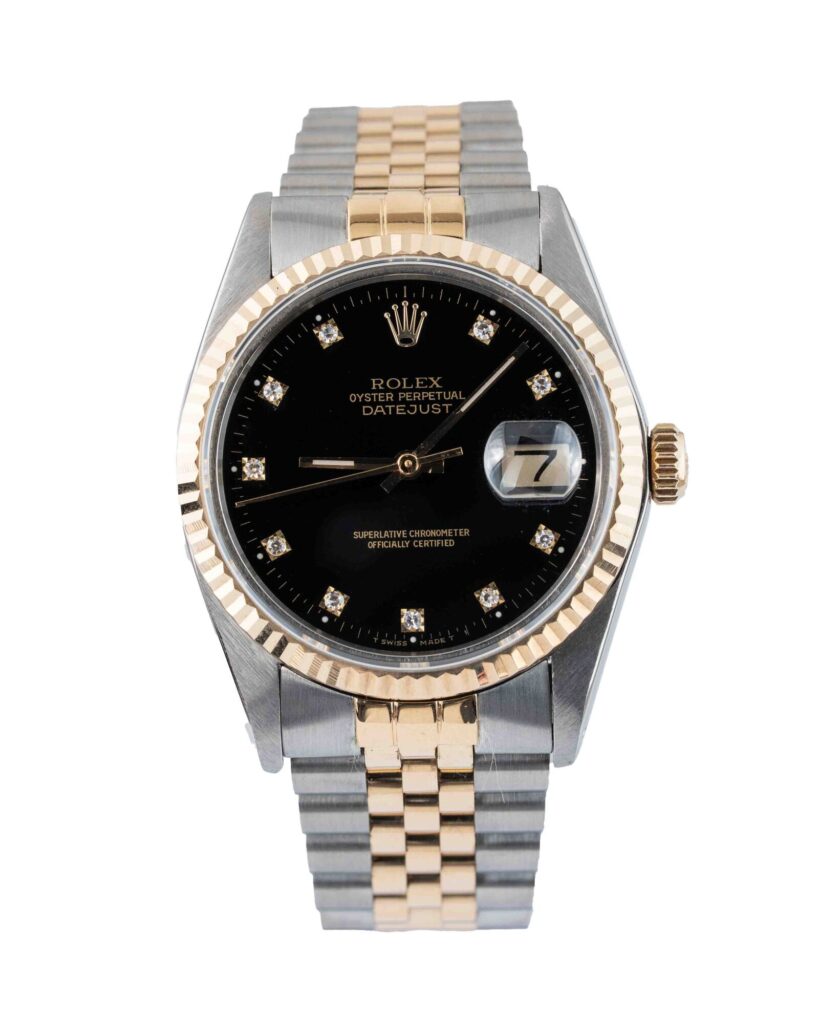 brand: Rolex Reference: 16013 Model: Datejust case MATERIAL: Steel & Yellow Gold strap: Bracelet case Size (MM): 36mm Dial colour: Black Bezel: Yellow Gold Condition: Good Box papers : Paperwork/box