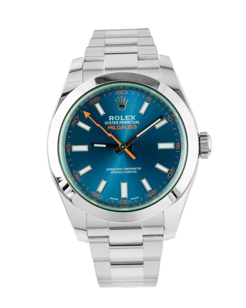 brand: Rolex Reference: 116400GV Model: Milgauss case MATERIAL: Steel strap: Bracelet case Size (MM): 40mm Dial colour: Blue Bezel: Steel Year: 10/2019 Condition: Excellent Box papers : Paperwork/box