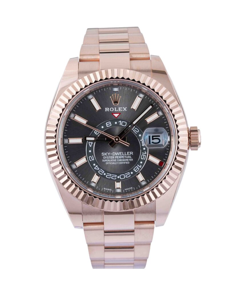 brand: Rolex Reference: 326935 Model: Sky-Dweller case MATERIAL: Rose Gold strap: Bracelet case Size (MM): 42mm Dial colour: Grey Bezel: Rose Gold Condition: Excellent Box papers : Paperwork/box