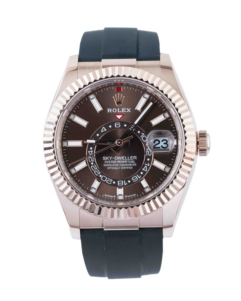 brand: Rolex Reference: 336235 Model: Sky-Dweller case MATERIAL: Rose Gold strap: Rubber case Size (MM): 43mm Dial colour: Brown Bezel: Rose Gold Year: 12/2023 Condition: Excellent Box papers : Paperwork/box