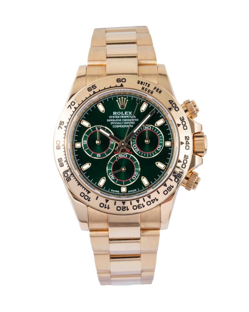 brand: Rolex Reference: 116508 Model: Daytona case MATERIAL: Yellow Gold strap: Bracelet case Size (MM): 40mm Dial colour: Green Bezel: Yellow Gold Year: 07/2019 Condition: Excellent Box papers : Paperwork/box