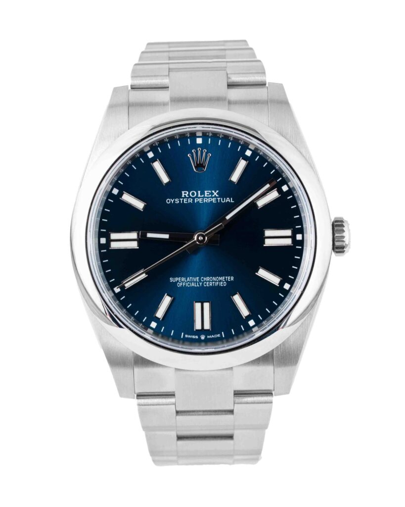brand: Rolex Reference: 124300 Model: Oyster Perpetual case MATERIAL: Steel strap: Bracelet case Size (MM): 41mm Dial colour: Blue Bezel: Steel Year: 02/2024 Condition: Unworn Box papers : Paperwork/box