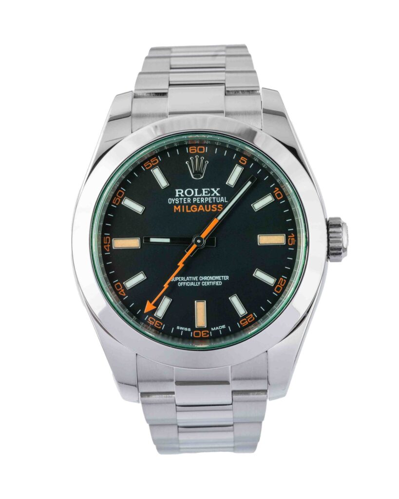 brand: Rolex Reference: 116400GV Model: Milgauss case MATERIAL: Steel strap: Bracelet case Size (MM): 40mm Dial colour: Black Bezel: Steel Year: 10/2020 Condition: Excellent Box papers : Paperwork/box