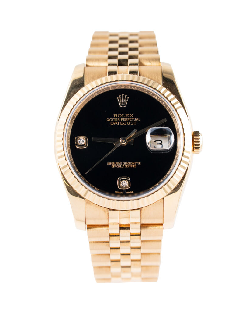 Pre-Owned Rolex Datejust 36 Black Onyx Diamond Yellow Gold 36mm – 116628 36mm Yellow Gold Case, Fluted Bezel, Crown Set On The Right Side As Well As The Date. Independent 12 hour Hand, Black Onyx Diamond Dial, Yellow Gold Jubilee Bracelet. Complete With Original Box, Invoice And 12 Months Warranty From Watch The Time.