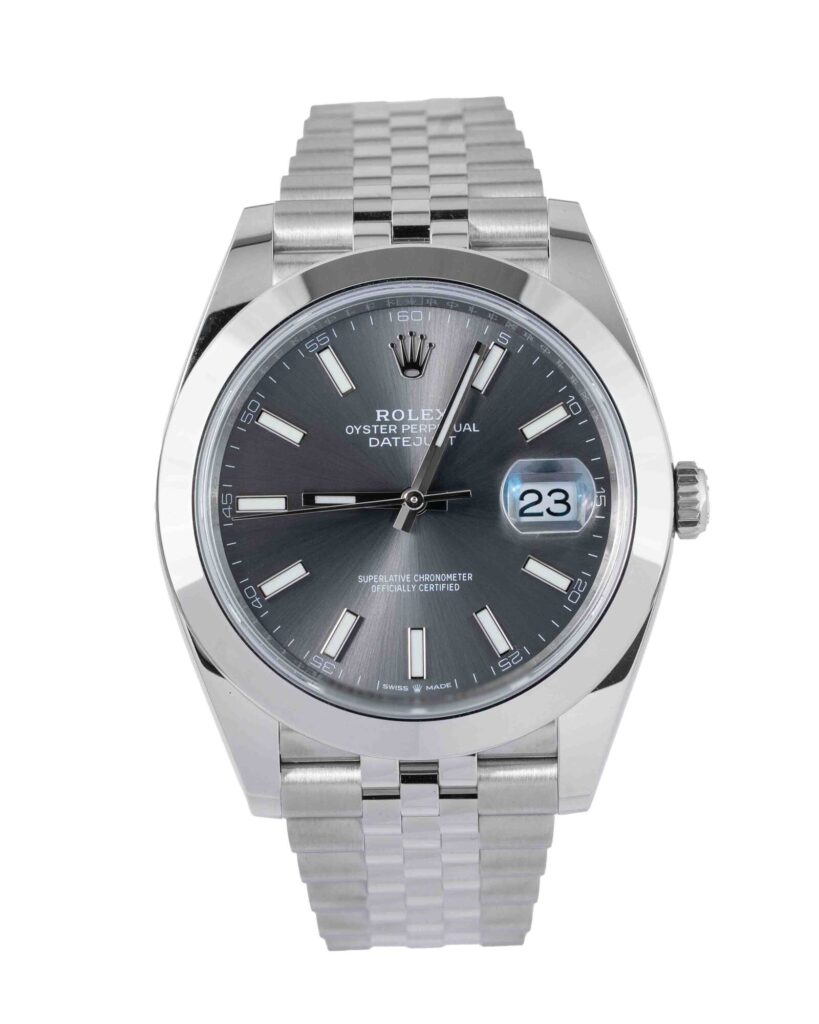 brand: Rolex Reference: 126300 Model: Datejust case MATERIAL: Steel strap: Bracelet case Size (MM): 41mm Dial colour: Grey Bezel: Steel Year: 03/2024 Condition: Unworn Box papers : Paperwork/box