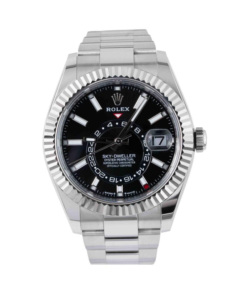 brand: Rolex Reference: 336934 Model: Sky-Dweller case MATERIAL: Steel strap: Bracelet case Size (MM): 42mm Dial colour: Black Bezel: White Gold Year: 10/2024 Condition: Excellent Box papers : Paperwork/box