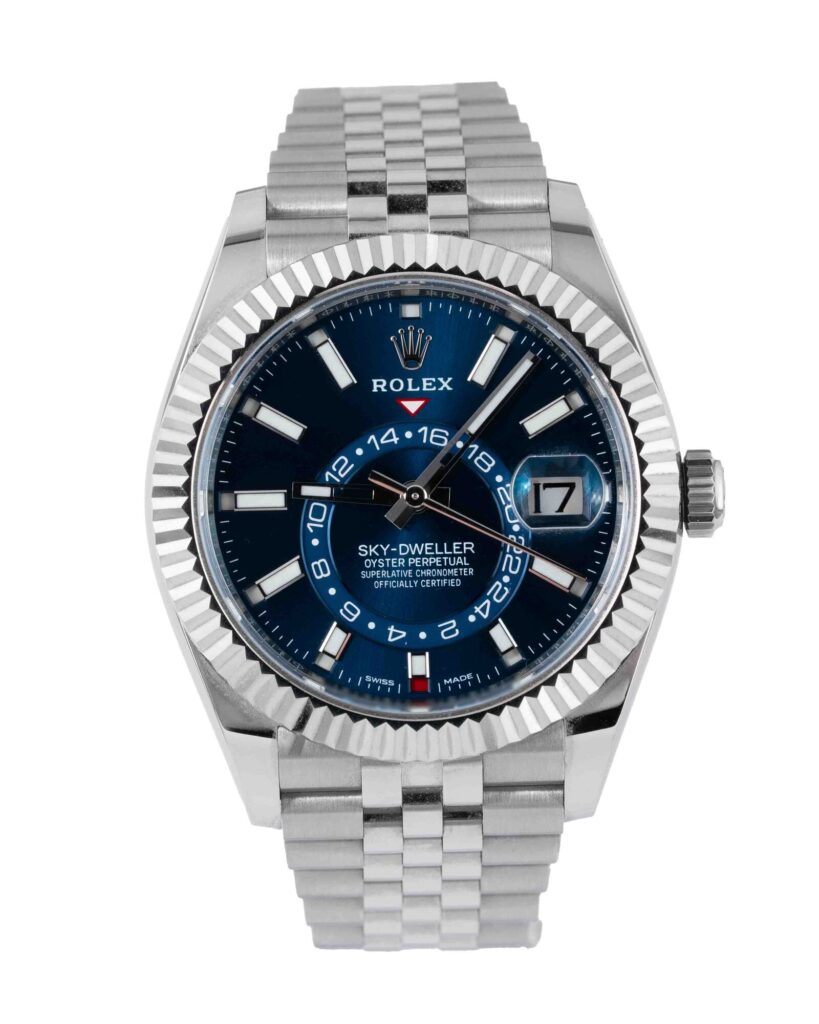 brand: Rolex Reference: 326934 Model: Sky-Dweller case MATERIAL: Steel strap: Bracelet case Size (MM): 42mm Dial colour: Blue Bezel: Steel Year: 04/2021 Condition: Excellent Box papers : Paperwork/box