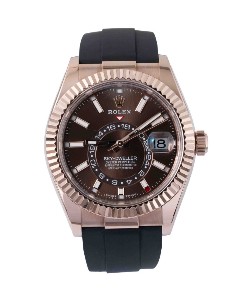 brand: Rolex Reference: 336235 Model: Sky-Dweller case MATERIAL: Rose Gold strap: Rubber case Size (MM): 43mm Dial colour: Brown Bezel: Rose Gold Year: 10/2024 Condition: Excellent Box papers : Paperwork/box