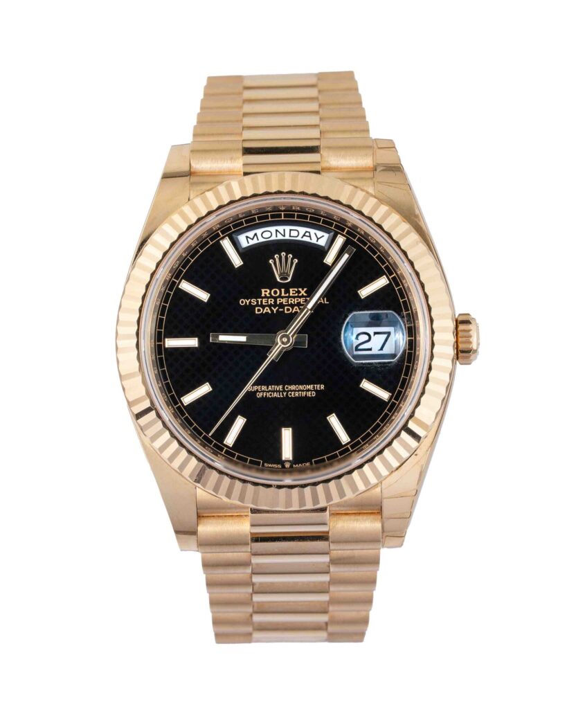 brand: Rolex Reference: 228238 Model: Day-Date case MATERIAL: Yellow Gold strap: Bracelet case Size (MM): 40mm Dial colour: Black Bezel: Yellow Gold Year: 01/2023 Condition: Excellent Box papers : Paperwork/box
