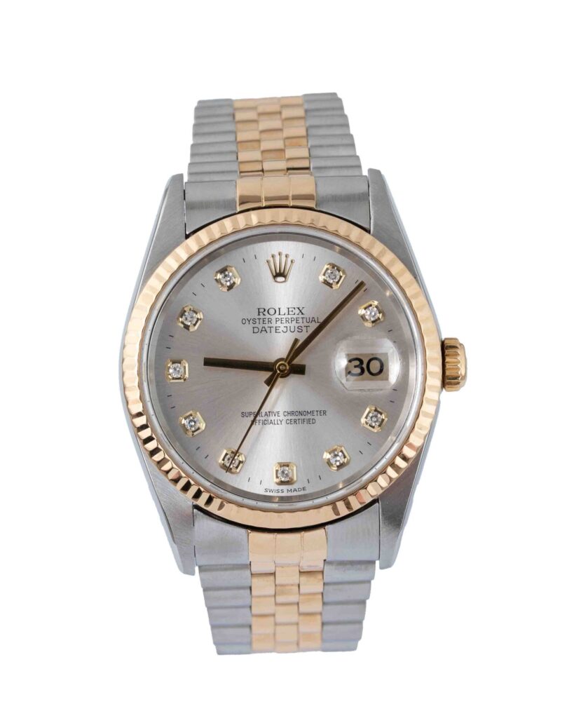 brand: Rolex Reference: 16233 Model: Datejust case MATERIAL: Steel & Yellow Gold strap: Bracelet case Size (MM): 36mm Dial colour: Silver Bezel: Yellow Gold Year: 10/1999 Condition: Excellent Box papers : Paperwork/box