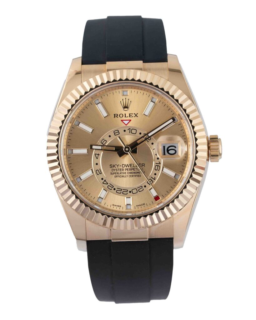 brand: Rolex Reference: 326238 Model: Sky-Dweller case MATERIAL: Yellow Gold strap: Rubber case Size (MM): 42mm Dial colour: Champagne Bezel: Yellow Gold Condition: Excellent Box papers : Paperwork/box