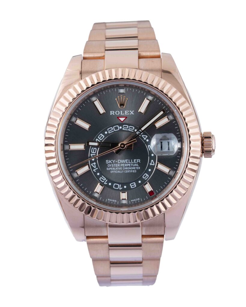 brand: Rolex Reference: 326935 Model: Sky-Dweller case MATERIAL: Rose Gold strap: Bracelet case Size (MM): 42mm Dial colour: Grey Bezel: Rose Gold Year: 05/2021 Condition: Excellent Box papers : Paperwork/box