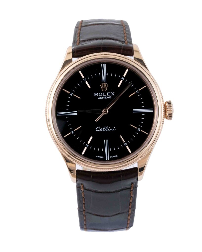 brand: Rolex Reference: 50505 Model: Cellini case MATERIAL: Rose Gold strap: Leather case Size (MM): 39mm Dial colour: Black Bezel: Rose Gold Year: 02/2017 Condition: Excellent Box papers : Paperwork/box