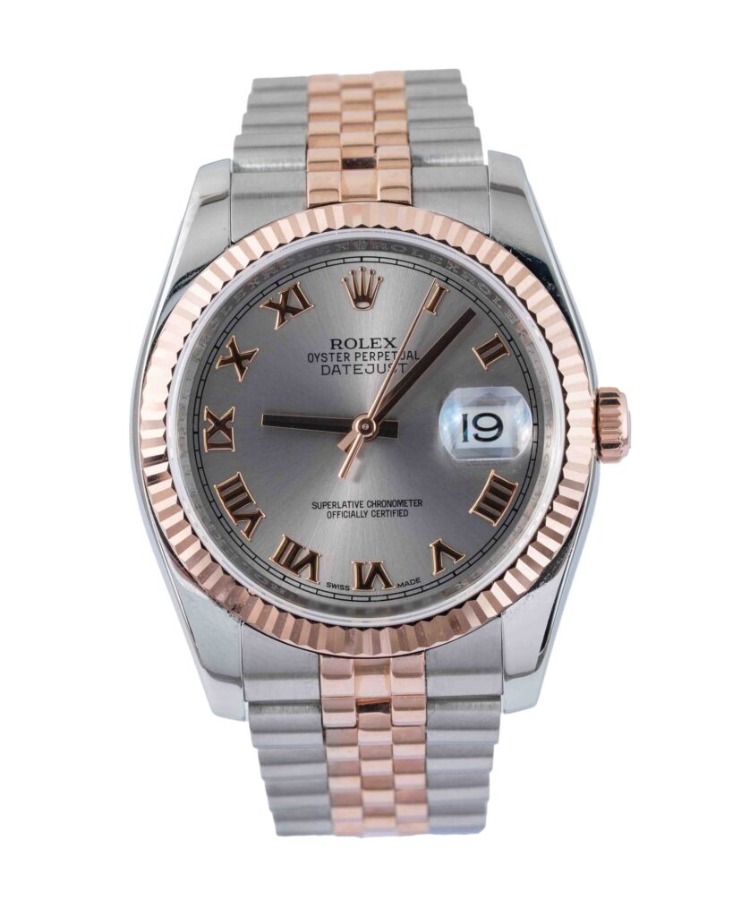 brand: Rolex Reference: 116231 Model: Datejust case MATERIAL: Steel & Rose Gold strap: Bracelet case Size (MM): 36mm Dial colour: Grey Bezel: Rose Gold Condition: Good Box papers : Paperwork/box