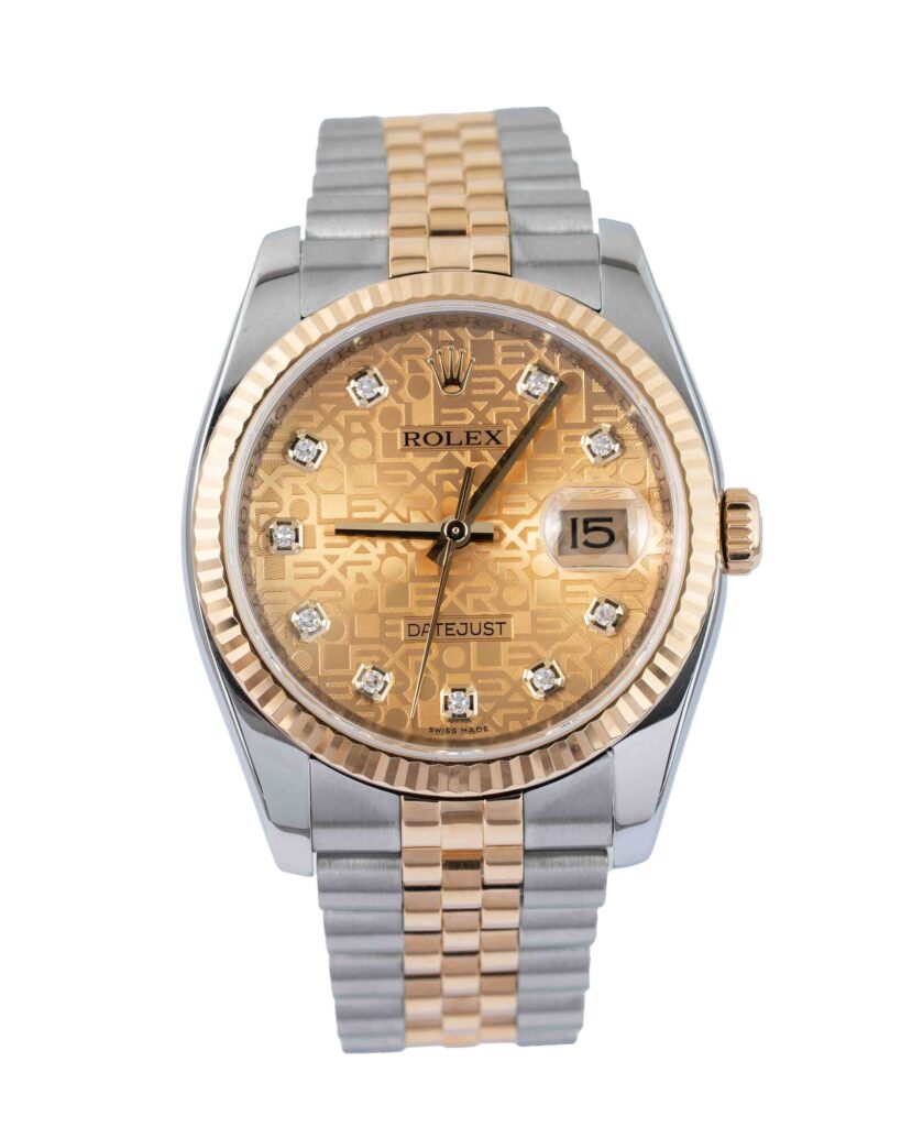 brand: Rolex Reference: 116233 Model: Datejust case MATERIAL: Steel & Yellow Gold strap: Bracelet case Size (MM): 36mm Dial colour: Champagne Bezel: Yellow Gold Condition: Excellent Box papers : Paperwork/box