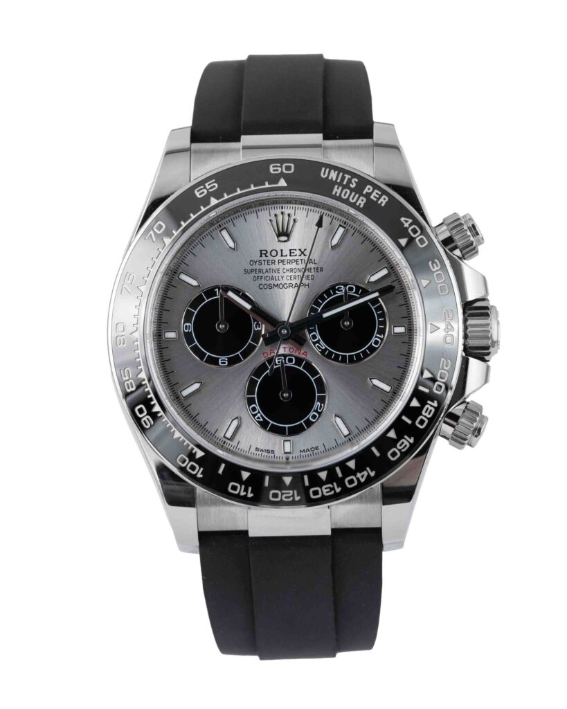 brand: Rolex Reference: 126519LN Model: Daytona case MATERIAL: White Gold strap: Rubber case Size (MM): 40mm Dial colour: Grey Bezel: Ceramic Year: 02/2024 Condition: Excellent Box papers : Paperwork/box