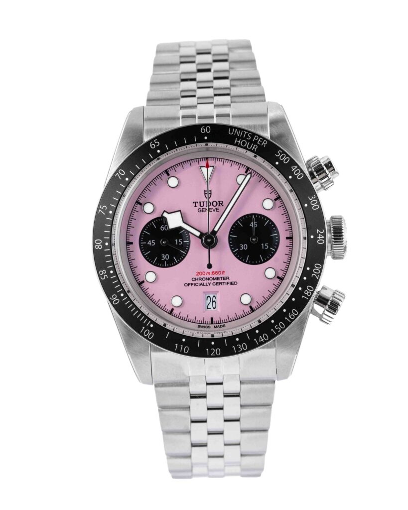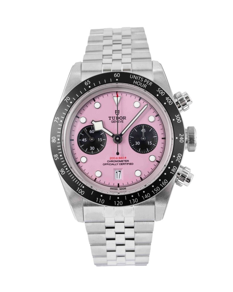 brand: Tudor Reference: 79360N Model: Black Bay Chrono case MATERIAL: Steel strap: Bracelet case Size (MM): 41mm Dial colour: Pink Bezel: Steel Year: 06/2024 Condition: Unworn Box papers : Paperwork/box