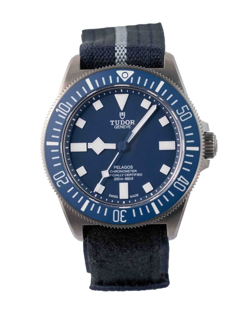 brand: Tudor Reference: 25707B/22 Model: Pelagos case MATERIAL: Titanium strap: Fabric case Size (MM): 42mm Dial colour: Blue Bezel: Ceramic Year: 05/2022 Condition: Excellent Box papers : Paperwork/box